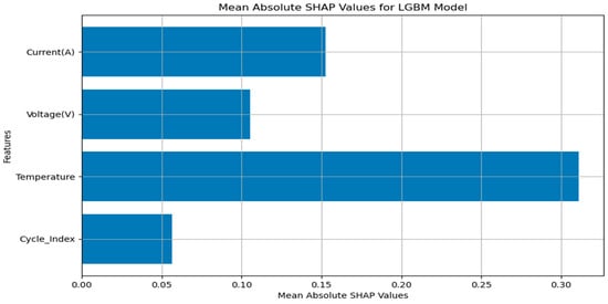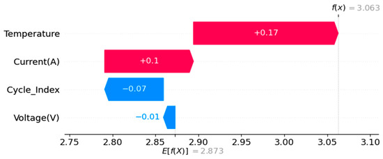 In Figure 4, the “Temperature” and “Current (A)” features are represented by positive SHAP values, indicating that these features increase the model predictions. Particularly, “Temperature” has the highest positive impact (+0.17), suggesting that an increase in temperature significantly enhances the prediction of discharge capacity. “Current (A)” has a lower positive effect (+0.1) on the predictions. On the other hand, the “Cycle_Index” and “Voltage(V)” features are represented by negative SHAP values, indicating that these two features decrease the model predictions. “Cycle_Index” (−0.07) is the most significant factor reducing model predictions, while the effect of “Voltage (V)” is relatively smaller (−0.01). With E[f(X)] value determined as 2.873, adding SHAP values results in the final model prediction f(X) reaching 3.063. This clearly demonstrates how the total effect of features contributes to changes in model predictions. Figure 5 provides the graph of average absolute SHAP values.