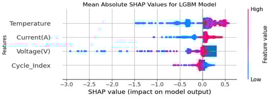 In this study, the LightGBM model, which exhibited the best performance among the models developed for predicting LiBs’ discharge capacities, was subjected to explainability analysis using SHAP [28]. SHAP allows for the quantitative evaluation of the effects of features contributing to a model’s predictions through Shapley values derived from game theory. This analysis was conducted to unveil the strongest and weakest impacts on predictions, thus providing a deeper understanding of how the model operated and making the dynamics underlying predictions comprehensible. This analysis visually and understandably presents which features the model assigns more weight to and the effects of these features on prediction outcomes [29]. In Figure 4, the impact of four main features used in LiB discharge capacity predictions by the LightGBM model is explained using the SHAP model. After all the dataset features and predictions are made, the decisions made by the LightGBM algorithm, which gives the most successful results and performance, are interpreted with the SHAP technique. When interpreting with the SHAP technique, the impact ratios of the input feature “Temperature”, “Current (A)”, “Voltage (V)”, and “Cycle Index”, which are feature names, in determining the output feature “Discharge Capacity” are evaluated.