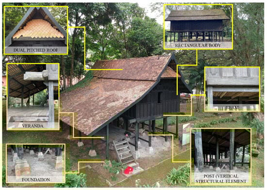 Malaysia’s cultural heritage is enriched with buildings with unique designs that reflect the cultural diversity of the country [4]. Traditional Malay houses, the vernacular dwelling of the Malays, represent one of the most significant items of local cultural heritage. They are timber houses raised on stilts [5] and basically consist of a main building unit with a cluster of several building units that have very flexible form [6]. The main unit of the house is distinctive for its largest volume and highest roof [7]. It consists of foundations in a form of plinths made of hardwood or concrete stumps [8], rectangular frame of posts and beams and trussed roof assembled with complex joint system. [9]. Traditional Malay houses are constructed of highly durable timber species, commonly Chengal wood (Neobalanocarpus heimii) [10]. Figure 1 shows that a typical traditional Malay house has a dual pitch, steep roof [5], with aesthetic forms expressed in a combination of geometrical shapes, lines, and curves [11]. Traditional Malay houses have open spaces, classified based on their functions and defined by floor level change with the absence of walls for ventilation and lightning purposes [8,12]. They show regional variations through a set of unique styles that are mainly recognized by their distinctive roof shapes. Traditional Malay houses not only reflect the indigenous architecture and local philosophy of the Malays [13] but also meet the Malays’ socio-economic, cultural, and environmental needs [5].