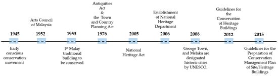 The federal and state government introduced acts and decrees, such as the Antiquities Act 1976 and the Town and Country Planning Act 1976, to grant local heritage conservation [31]. The Heritage of Malaysia Trust 1993 and National Heritage Act 2005 were released and enacted for the same purpose too [1]. In 2006, the National Heritage Department was established under the National Heritage Act. After two years, UNESCO designated George Town and Malacca as World Heritage Sites because George Town and Malacca fulfill the second, third, and fourth Outstanding Universal Value Criteria. Since then, heritage conservation has attracted the attention of many Malaysian parties [33,34]. The Guidelines for the Conservation of Heritage Buildings (2012) and Guidelines for the Preparation of Conservation Management Plan of Site/Heritage Buildings (2015) were prepared and published by the National Heritage Department. The purpose of these guidelines is to support the conservation of heritage buildings and sites [1] and ensure that all conservation practices are in accordance with the 2005 National Heritage Act [35]. Figure 2 presents the major milestones of heritage conservation in Malaysia.