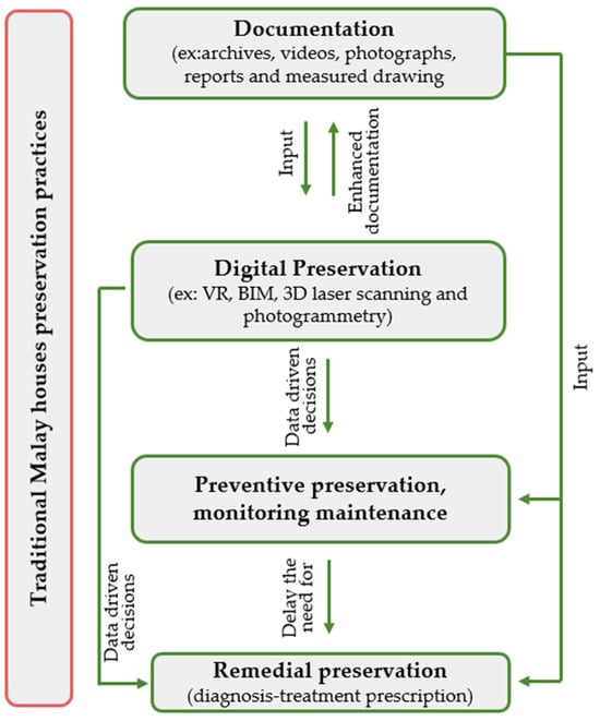 Based on the approach adopted, practices that aim to preserve traditional Malay houses can be divided, as shown in Figure 3, into documentation activities, remedial actions, preventive measures, and the implementation of digital technologies. These practices are discussed in the following subsections.