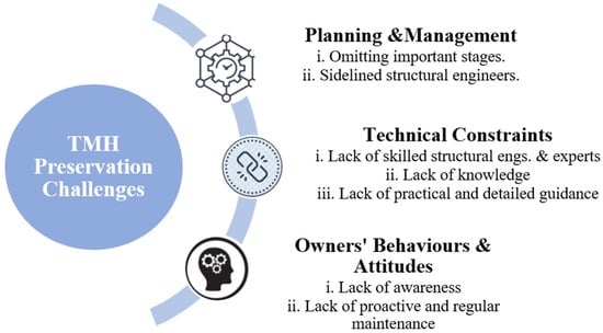 A clearly specified set of challenges is the basis for identifying possible workarounds and designing efforts to overcome obstacles that hinder preservation progress. Issues and challenges experienced in traditional Malay house preservation have been highlighted by many researchers such as Harun [2], Sulaiman [31], and Abdul Rahman et al. [65]. Based on their findings, these challenges can be divided into three groups: planning and management, technical constraints, and owners’ behavior and attitudes (Figure 4).