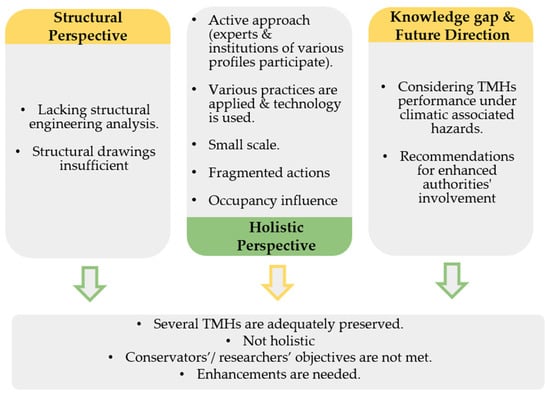 Regarding the monitoring and inspection aspects, actions are taken to propose an appropriate inspection and monitoring approach; although, these actions are fewer in number [52]. These actions compromise the involvement of house owners as a significant party in the preservation process. The house owners are empowered and trained to perform regular inspections and maintenance of their houses and adopt appropriate measures [52]. Such preservation practices, although lacking the focus and skills required to resolve the damage to structural elements, raise the awareness of the community in heritage conservation; this is as important as the preservation work [53]. Furthermore, this demonstrates that citizen participation is a potential mechanism in preserving traditional Malay houses to achieve sustainable development, consistent with the modern preservation approach described by Curcic et al. [53]. The case is the same in the South-West Europe. Projects, such as The HeritageCARE project, are organized with the aim of outlining proper methodology for the preventive conservation of cultural heritage structures. Such projects arose in response to the shortcomings of the preventive conservation in the South-West Europe represented by intermittence and lack of methodical strategy [54].