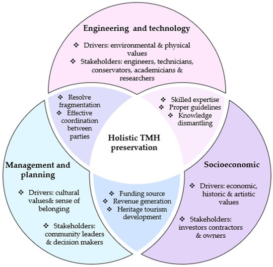 Multidimensional preservation, characterized by the simultaneous involvement of various profile experts and the effective engagement of structural engineers, is a powerful approach. It encompasses addressing all dimensions: engineering and technology, socioeconomic, planning, and management (Figure 6); these dimensions are addressed simultaneously according to the objectives of the local community and sustainable pillars [72]. This approach requires structural engineers to be trained regarding their crucial role in preserving Malay houses and equipped with the skills and tools required for houses preservation. It also entails considering all the values embedded in traditional Malay houses, as these values are the main drivers of a diverse stakeholder set. The more values are considered jointly, the more funding, support, and skills of capable parties will be drawn, and the more efficient and sustainable the preservation of Malay houses will be. Multidimensional preservation leads to the development of different forms of partnership. This enables costs, risks, and benefits to be shared and allocated to different parties [72] based on which party is best suited to take them or which party has the greatest interests and capabilities to maximize the potential returns that may occur due to Malay house preservation. This, in turn, accelerates and strengthens the preservation of traditional Malay houses.