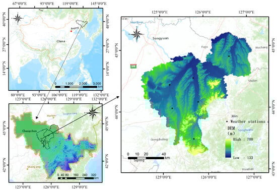 Changchun, situated in Northeast China and serving as the capital of Jilin Province, lies on the northeastern edge of the Middle Liaohe Plain. Being an essential industrial hub in Northeast China, Changchun boasts not only rich historical and cultural resources but also a significant economic stance. Recently, the city has encountered frequent extreme rainfall events, particularly during the summer months of June through August, marked by a significant increase in rainfall. Such extreme rainfall events have presented severe challenges to the city’s transportation infrastructure. Waterlogged roads and traffic jams have become commonplace, significantly distressing residents and hindering the transportation of goods. During these months of frequent rainfall, Changchun’s transportation system often grinds to a halt, with traffic congestion becoming typical, thereby impacting the city’s routine operations and economic growth. The study area is depicted in Figure 1.