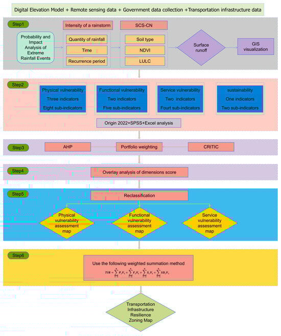 Flowchart for assessing the resilience of urban transportation infrastructure under extreme rainfall.