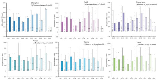 After analyzing the temporal patterns of extreme rainfall events in Changchun over the past decade (2011–2020), our study noted a significant increase in both the frequency and intensity of these meteorological events. This trend not only highlights the inherent vulnerabilities of Changchun’s urban transportation infrastructure but also emphasizes the urgent need to reevaluate and enhance existing resilience strategies in response to these evolving climate challenges. Figure 3 illustrates the variations in daily rainfall in Changchun and its surrounding areas from 2011 to 2020. Despite considerable year-to-year variability in rainfall patterns, the data indicate a clear upward trend in the frequency and intensity of extreme rainfall events. Our analysis identified substantial increases in extreme rainfall in specific years, notably 2013 and 2019, which underscore the potential vulnerabilities of the urban transportation infrastructure in the region. For instance, in Changchun City, the marked increases in both the median and upper quartiles of daily rainfall in these years suggest that the capacity of the drainage systems may be insufficient to manage sudden, intense downpours, potentially causing severe disruptions to urban transportation. These trends and data strongly advocate for the need to focus on the risk of extreme rainfall events in the planning and development of more resilient transportation infrastructure. These findings underscore the crucial nexus between climate change-induced weather patterns and urban infrastructure resilience, calling for a proactive, integrated approach to urban planning that prioritizes adaptive strategies in the face of climate uncertainty. Next, Section 3.2 delves further into the specific impacts of these extreme rainfall events on urban surface runoff and their regional manifestations, providing a scientific foundation for developing subsequent enhancement strategies.