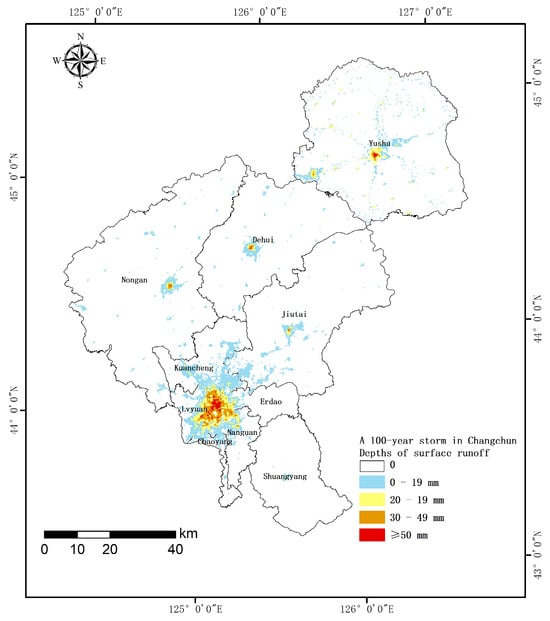 In modeling the spatial distribution and relative depth of urban flooding in Changchun, this research utilized the formula for the intensity of a 100-year rainstorm in Changchun (2015). This choice is predicated on the assumption that the entire city is subject to the same rainfall pattern of a 100-year (180 min) major storm. The depth and area of surface runoff were determined using SCS-CN, with simulation results depicted in Figure 4. Figure 4 illustrates the variations in runoff depths across the Changchun area, notably in core urban areas like Kuancheng, Chaoyang, Nanguan, and Luyuan, which exhibit a significant risk of inundation. This differential susceptibility underscores the urgent need for targeted flood prevention strategies in high-risk areas. Additionally, while areas like Erdao and Dewei exhibit low runoff depths, the potential for flood impacts necessitates comprehensive urban planning and resilience measures. Consequently, special consideration must be allocated to countermeasures for these high-risk areas in the planning of urban flood control and drainage facilities. Moreover, despite suburban and peri-urban areas facing lower depths of surface runoff, the lesser infrastructure and emergency response capacity compared to urban areas demand due attention and planning to enhance these areas’ flood protection capacity. A comprehensive flood prevention strategy is advocated, focusing on optimizing the drainage system in core areas, enhancing natural rainwater infiltration through ecological infrastructure development, and constructing flood barriers in vulnerable areas. Furthermore, establishing a comprehensive flood monitoring and early warning system, developing detailed emergency response plans, and elevating citizens’ flood awareness through community education are imperative. Implementing flood-resistant designs in new infrastructure to protect critical facilities and promoting green transportation systems is crucial for bolstering cities’ overall resilience and coping mechanisms against future extreme weather events.