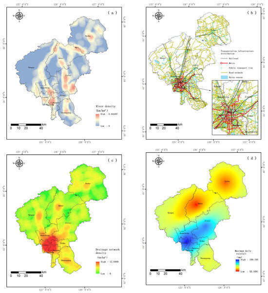 (c) Drainage network density: The design of urban drainage networks is critical to mitigating the waterlogging effects of extreme rainfall. Dense drainage systems can quickly remove water from road surfaces, minimize structural damage, and ensure that roads remain open [].
