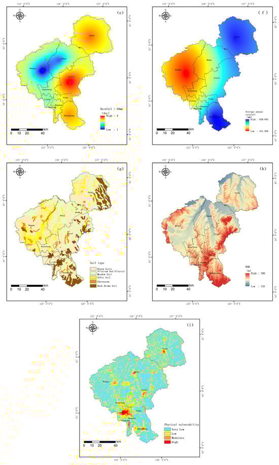(a) River density, (b) Transportation infrastructure distribution, (c) Drainage network density, (d) Maximum daily rainfall, (e) Number of days with annual rainfall > 50 mm, (f) Average annual rainfall, (g) Soil type, (h) DEM, (i) Physical vulnerability assessment map.