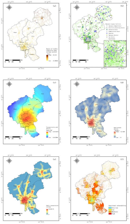 (a) Degree of traffic congestion under extreme rainfall, (b) Emergency Response Facilities Distribution, (c) Transportation node density, (d) Road network density, (e) Public transportation coverage, (f) Functional vulnerability assessment map.