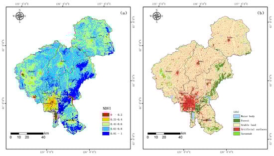 Spatial distribution of sustainability indicators (a) NDVI, (b) LULC.