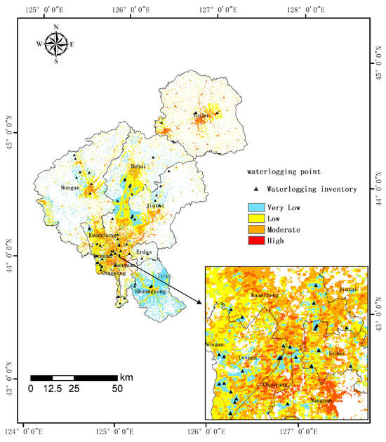 To ascertain the reliability of the model employed in this study, this section presents a validation analysis through the examination of 266 flooding points recorded in Changchun City from 2017 to 2021 []. The data for these flooding incidents, derived from field surveys and news reports, illustrate waterlogging phenomena in specific city locales during extreme rainfall events, thus underscoring the physical vulnerability of the infrastructure in these areas. Utilizing GIS technology, the spatial distribution of the flooding points (Figure 10) was juxtaposed against the transportation infrastructure resilience areas delineated in this study. This analysis revealed a significant concentration of flooding points in low-resilience areas, particularly in very low resilience areas (light blue areas), aligning closely with the model’s predictions and affirming the heightened flood risks in these locales. In addition, flooding points were observed in areas of medium resilience (orange areas) and even high resilience capacity, highlighting the fact that no area can be completely protected from the risk of flooding during extreme rainfall events and emphasizing the need for integrated urban and infrastructure planning.