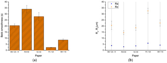 Figure 1 displays the relation between the Bekk smoothness (Figure 1a) and basic roughness parameters (Ra and Rz) of the papers used in this research (Figure 1b). Although the direct negative correlation between smoothness and roughness was not expected since the principles of measurements are different, there is a visible inverse proportionality in the relation of the values. The highest average roughness Ra and Rz parameters, as well as the lowest smoothness (2.3 s), were found for the PC 120 paper (4.85 µm and 32.05 µm, respectively). The lowest average Ra and Rz parameters were found for the RW 80 paper (1.90 µm and 14.09 µm, respectively). The highest smoothness, of 34 s, was found for the same paper. It can be seen that the roughness and smoothness vary significantly among the papers used in this research. These results are of great importance for understanding the interaction of the paper with the printing ink, as many studies have shown that these parameters are responsible, among others, for the functional properties of the inks and the colorimetric properties of the prints. In some cases, the surface of the paper can be coated to achieve an optimal print quality, as it is known that the additional coating of the paper can improve the mechanical and colorimetric properties of the prints [57]. Alternatively, additional fillers can be used in the papermaking process to improve the mechanical and surface properties of the paper [56]. It has also been shown that a low value of smoothness and a high value of roughness parameters affect the optical density of prints, the gloss, and the general paper properties [40].