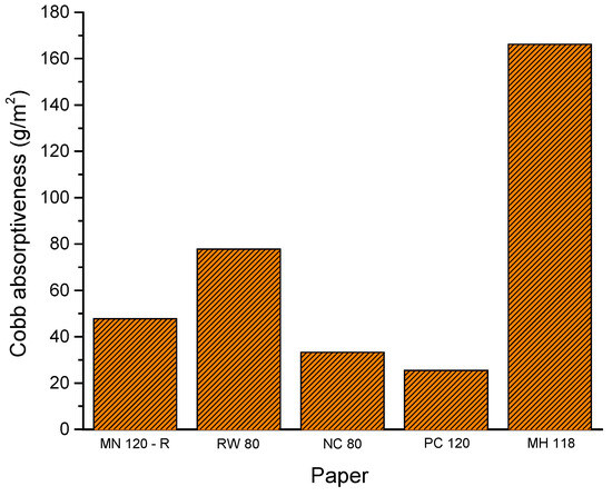 In addition, the paper density is an indicator of the relative air content in the paper [51]. The results presented in Table 1 show the highest density of 0.84 g/cm3 was that of the reference sample MN 120-R, followed by RW 80 (0.83 g/cm3), NC 80 (0.79 g/cm3), MH 118 (0.70 g/cm3), and PC 120 (0.60 g/cm3). This property of paper varies inversely with the specific volume (bulk), which is calculated using the following formula [37]: