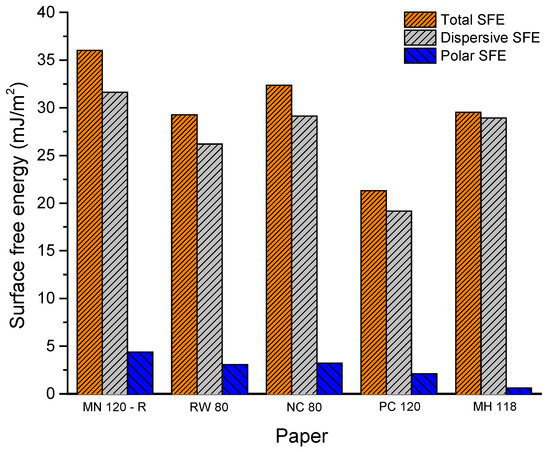 The total, dispersive, and polar SFE components of the papers are presented in Figure 3. Paper MN 120-R has the highest total, dispersive, and polar SFE among the papers used in this research (36.01, 31.63, and 4.38 mJ/m2, respectively). The lowest total and dispersive SFEs were found with PC 120 (21.3 and 19.18 mJ/m2, respectively). A low polar SFE (<5 mJ/m2) is characteristic of cellulose-based paperboard surfaces [62]. The significantly lower SFE of PC 120 (in comparison to the other papers) could be associated with the presence of fillers that decrease the SFE (CaCO3, clay, and/or talc) [63,64]. Specifically, the components in paper such as hydrophobic sizing agents, wood extractives, and fillers (for example, CaCO3, clay, and talc), decrease the surface free energy [65]. There is no significant difference in the total or dispersive SFE of papers MH 118, RW 80, and NC 80. The lowest polar SFE (0.62 mJ/m2) was found for paper MH 118. It can be expected that the adhesion between the papers and printing inks, as well as other surface interactions resulting in the changed quality of the prints, will be affected by differences in the SFE components of the papers.