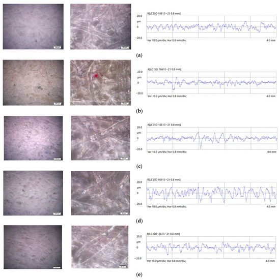 Micrographs (mag. 20×, 100×) and line profiles of paper substrates, according to the [66]. (a) MN 120-R, (b) RW 80, (c) NC 80, (d) PC 120, (e) MH 118.