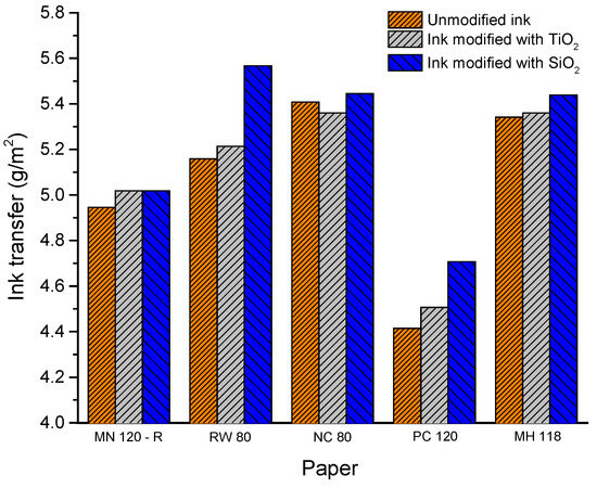 The results of the measured ink transfer for all the selected papers printed with the unmodified and modified offset ink are shown in Figure 5.