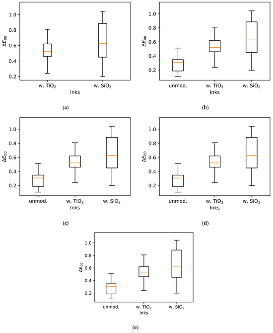 The colorimetric properties of the printed samples are compared in Figure 6. The mean of ten CIE L*a*b* values measured on the MN 120-R paper printed with unmodified ink was taken as a reference. Each boxplot represents the CIEDE2000 difference between ten measurements for a given substrate and ink, and the reference. Note that Figure 6a, unlike the others, does not display the results for the unmodified ink, since this is the reference condition. The boxplots reveal that different inks printed on different substrates do not result in considerable colorimetric differences compared to the reference conditions, since most measurements fall well below ΔE00 = 1, which is considered to be a just-noticeable difference (JND). For all the papers except the reference, it can be noted that the interquartile ranges of the boxplots for the modified inks do not overlap with those for the unmodified inks, which could indicate the presence of statistically significant differences between the modified and unmodified inks. However, the absolute values of the colorimetric differences are small with respect to the JND. To conclude, neither the choice of paper nor the ink resulted in considerable colorimetric differences with respect to the reference conditions.