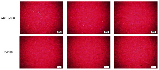 Figure 4 shows the microscopic images at 20× and 100× magnification as well as the line profiles of the paper substrates. As can be seen in Figure 4a, the surface structure of the reference sample MN 120-R, a paper based on virgin fibers, is uniform and interspersed with well-interwoven fibers of different widths. After evaluating the image at 100× magnification, it can be seen that the fibers extend to a maximum width of 50 μm. Sample PC 120 (Figure 4d) has a surface structure that is the most irregular compared to all the observed samples, and is clearly visible on the line profile. The fibers are of a uniform width, long and without visible breaks; the fiber width is about 20 μm or more. Sample MH 118 has an interwoven fiber structure consisting of 30% hemp and 70% virgin fibers. The hemp fibers are narrow and interwoven between virgin fibers, which have a uniform shape without breaks. The papers made from 100% recycled fibers (RW 80 and NC 80) have a similar profile, with a surface structure of thin fibers interwoven in all directions in the surface structure. The particles of recycled material are visible in the RW 80 sample. The width of the fibers is different for both papers; the fiber width is between 20 μm and a maximum width of 50 μm.