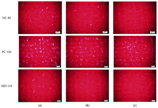 The microscopic images of the samples are shown in Figure 8. When comparing the individual paper samples printed with the unmodified ink, it can be seen that the observed ink completely covers the surface of the MN 120-R and RW 80 papers. The surface structure of the paper is most clearly visible in sample PC 120, which is comparable with the results of the roughness and smoothness of this sample. Paper PC 120 has the lowest smoothness (2.3 s) and shows the greatest unevenness in its surface structure compared to the other paper samples (Ra = 4.85 µm and Rz = 32.05 µm). Looking at the changes on the surface of the paper printed with the modified inks, it can be said that the addition of nanoparticles has a positive effect on the coverage of the printing inks. The positive effect of the nanoparticles is more pronounced in all the samples with the addition of nano-TiO2 than with the addition of SiO2. These results are consistent with the ink transfer results, where the positive effect of adding SiO2 nanoparticles is visible. The mottling results showed a similar result, with the addition of nanoparticles having the least effect on the PC 120 paper samples, as can be seen in the microscopic images. It can be said that these results play an important role in the development of good printability on recycled and non-woody papers in offset printing.