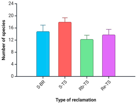 The results of the analysis showed no statistically significant differences between the number of species on the study plot variants. The average number of species was between 12.11 (Rb-TS) and 18.11 (S-TS; Figure 1).