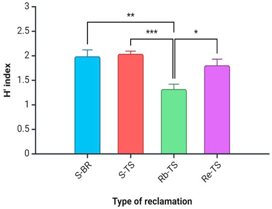 Differences between H’ index values of the study sites. Explanation: see Figure 1. Values are means ± SE for each parameter and each variant. Explanations: *—p < 0.05, **—p < 0.01, ***—p < 0.001.