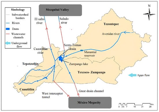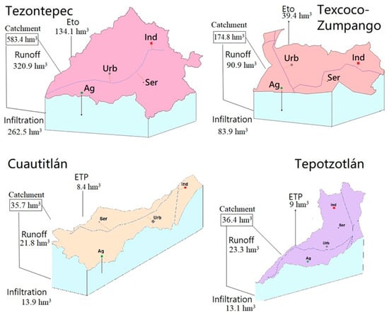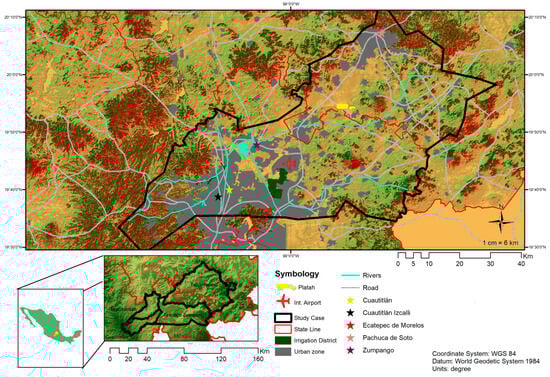- The area is considered a watershed and divided into four hydrographic sub-basins, three highly urbanized in the Mexico State (Tepotzotlán, Cuautitlán, Texcoco-Zumpango) and the greatest with more extensive agricultural land use in Tezontepec in the Hildago State. The boundaries were defined according to the topographic national data []. See Figure 2.