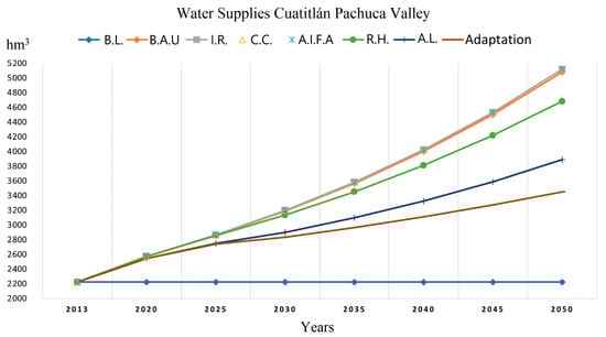 Avoiding leaks (A.L.). Adaptation scenario 2. Based on the A.I.F.A. scenario, we add the perturbation of water demand mitigation by increasing physical efficiency by leaking elimination in the urban areas’ water distribution system. For the Tezontepec sub-basin in Hidalgo, a 2% yearly infrastructure improvement is proposed from the 2020 to 2030 period [] and 0.3% afterward up to 2050. In the Mexico State sub-basins, the physical efficiency would increase by 0.6% annually from 2025 to reach a final improvement of 75% in 2050.