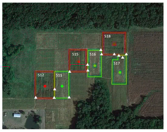 Site layout and survey locations at the Brighton site. Plots with red borders are corn and those with green are switchgrass; the plot number is in the upper left of each plot. Circles mark the approximate locations of sound recorders and white triangles mark the locations of point count stations used during the study. Only one station was used in each daily survey of each plot. Adjacent unmarked plots are planted in different switchgrass varieties (‘Shawnee’ or ‘Liberty’). To the right (east) is a large area planted with corn and soybeans in rotation. Woodland habitats occur to the north, south, and west of the surveyed plots.