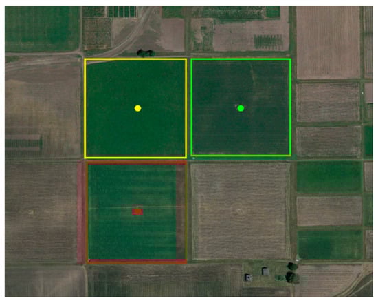 Site layout and survey locations at the Urbana site. The plot with the yellow border is prairie, that with the green border is switchgrass, and that with the red border is miscanthus. Circles mark the approximate locations of sound recorders and point count stations. Adjacent unmarked plots are planted in different bioenergy crops.