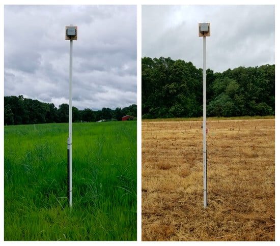 Swift sound recorders mounted in the center of plots at the Brighton site in June 2020. Recorders were mounted in the same way and at the same locations in 2021 and 2022. Left: Plot 511 (switchgrass); right: Plot 518 (corn).