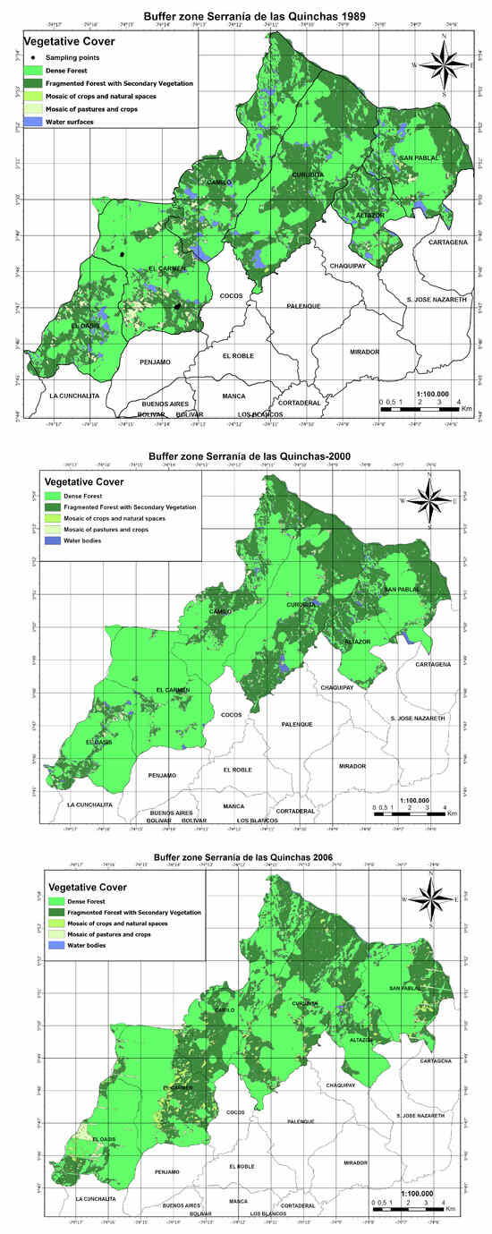 As shown in Figure 5, although dense forest areas are growing in the PNRSQ buffer area, they are more dispersed, and areas that were continuous dense forests in 1989 are now a mix of dense forest and secondary forest, showing an extracting activity with posterior recovery; some cases recover to a state very similar to that of the native forest, but in smaller continuous areas.