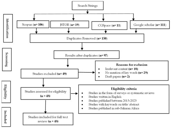 The first step of the PRISMA process was to identify scientific publications on the subject under consideration. Guided by past studies [25,26], the identification of scientific publications was performed by searching through Scopus, JSTOR, CGSpace, and Google Scholar databases. These databases were purposively chosen since they contain publications on the keywords of the subject. Multiple strings were used to search in all the databases, which included the following: