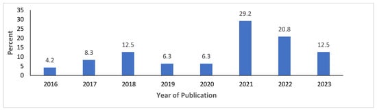 Apart from the source, the papers also vary by year of publication. The period under consideration is 2015 to 2023. However, no eligible paper was found to have been published in 2015. As shown in Figure 2, 29.2% were published in 2021, 20.8% in 2022, and 12.5% were published in both 2018 and 2023. The distribution suggests that there is an acute rise in interest in promoting smart agricultural technologies to smallholders in sub-Saharan Africa.