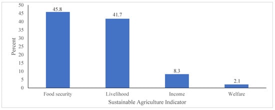 Further analysis revealed that the papers linked the application of smart farming technologies to different sustainable agricultural indicators such as environment, food security, income, livelihood, and welfare. The majority (45.8%) of the papers linked the applications of smart farming technologies to food security, and 41.7% linked it to livelihood. The further distribution of this relationship is shown in Figure 3.
