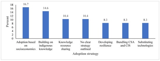 Farmers use different strategies to adopt smart farming technologies in sub-Saharan Africa. It was discovered that the bundling of land and water management practices is a key strategy used by farmers. As shown in Figure 4, the proportion of studies confirming this is 22.9% of the sample studies. The further distribution shows that 16.7% adopt the practices as a result of a push from socioeconomic factors. Also, 14.6% of the studies indicate that farmers adopt smart farming practices by building on their indigenous knowledge. Another strategy used by farmers is that they adopt technologies that permit knowledge sharing among themselves while others boast their resilience to climate variability by adopting some smart farming practices.
