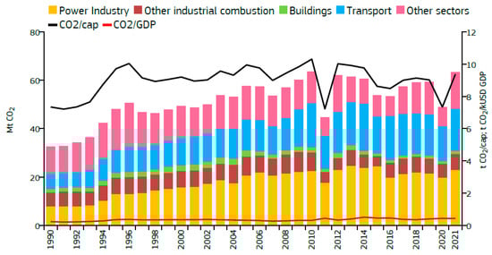 On the other hand, Libya is a member of the OPEC; with 48 billion barrels and 1.5 trillion m3 of oil, this North African nation holds the largest and fifth largest proven oil and gas reserves in Africa, respectively [7]. Nevertheless, these reserves only hold enough resources to last approximately 77 and 100 years, based on the regular production levels of 1.2 M barrel/day, before they run out. As the production of electrical power in Libya is entirely dependent on fossil fuels, this situation has severe consequences on sustainability. In addition, the primary contributor of greenhouse gas (GHG) emissions is carbon dioxide (CO2), with 90% of its stake stemming from traditional fuel combustion [8]. CO2 emissions and other poisonous emissions have a grave impact on the environment, including many deleterious alterations to the global climate. CO2 emissions in Libya reached around 63 Mt in 2021 compared to 27 Mt of total CO2 emissions in 1980. This is greater than the contributions of some developed industrial countries, such as Sweden (38.9 Mt) and Switzerland (35 Mt). Between 1990 and 2021, the CO2 arising from the Libyan power industry increased by 188% [9]. Figure 1 shows the CO2 emissions contributed by different sectors in Libya.