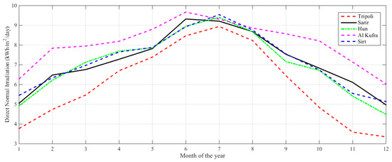 Site preference for CSP adoption mainly depends on the locational assessment of solar resources. Within the geographical boundaries of Libya, there are multiple choices of potential sites with a direct normal irradiance (DNI) of up to 2900 kWh/m2/yr. Figure 2 shows the long-term average monthly DNIs at six different locations around the country, extracted from [16]. In this research, the Sarir area (28.22° N, 19.13° E) in the middle of Libya was selected as a study site for the proposed hybrid CSP plant because it hosts an operational gas power facility. The selected area receives an annual average direct normal irradiance of 7.17 kWh/m2/day.