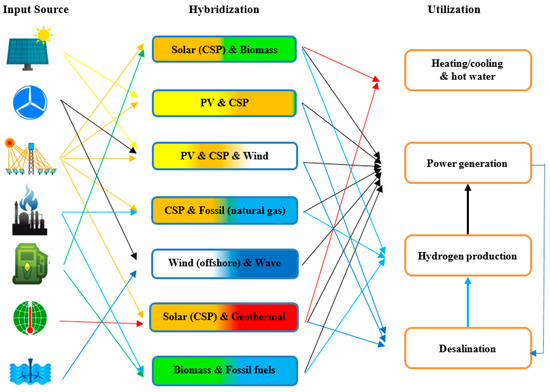 Several factors affect the pairing strategy of CSP with various energy systems. This differs according to the plant’s characteristics and performance metrics, such as specific investment, cost effectiveness, solar share, energy and exergy efficiency, solar-to-electricity efficiency, and the capacity factor [46]. The route towards RE-based hybridization and its utilization in Libya is demonstrated in Figure 3. In order to simultaneously meet the energy demands for electricity, cooling/heating, transportation, and desalination, the multi-generation/poly-generation system is applied.