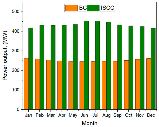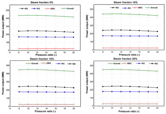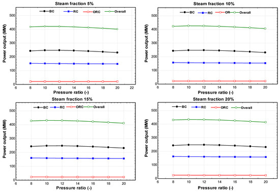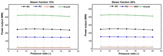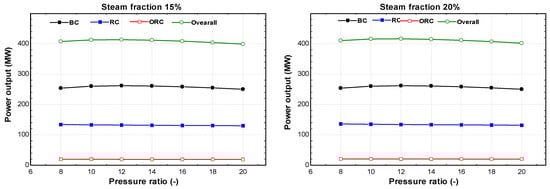 The megawatt power outputs of the BC, RC, ORC, and overall power yield for June with the variations in the BC pressure ratio and steam fractions are presented in Figure 5. The overall power output from the triple combined system is highly dependent on the pressure ratio of the BC. The results indicate that the overall power output increases with an increase in the pressure ratio until it reaches a maximum point and then starts to decline. As the BC pressure ratio increases, the compressed air temperature also increases, leading to an improvement in the combustion process of the natural gas and an increase in the turbine inlet temperature. Eventually, greater GT power is produced. Meanwhile, a large part of the power produced by the GT is consumed by the AC at a higher pressure ratio. Moreover, at a higher pressure ratio, the temperature of the exhaust gases at the exit of the GT decreases, leading to a reduction in the energy available for steam generation in the HRSG; hence, the power is produced by the steam turbine and the ORC turbine.