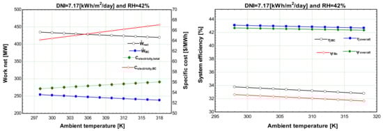 In Equation (6), is the efficiency of the parabolic trough collector, is the area of the solar field, and DNI is the direct normal irradiance at Sarir (28.22° N, 19.13° E) for the month of interest. The work output in the Brayton cycle is estimated as follows: