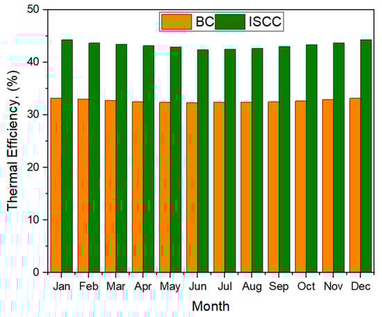 ISCC plants use natural gas to fuel BC gas turbines along with recovered waste heat in an HRSG to run a steam cycle, with solar heat often being integrated into the bottoming steam cycle [48]. Both linear and central receivers can be used to obtain a wide range of solar collection heat, yet most of the ISCC power systems in operation today use PTC (parabolic) technology. When compared to standalone CSP technology, the ISCC configuration reduces solar electricity costs by 35–40% [49] and can provide a significant solar share, resulting in substantial fuel savings [50]. Behar et al. [51] reported that ISCC systems using parabolic troughs and direct steam generation (DSG ISCC) technology outperform those with HTF technology (HTF ISCC). They also stated that DSG ISCC systems have greater thermal efficiency, a 3% lower levelized energy cost, and 2.5% less GHG emissions.