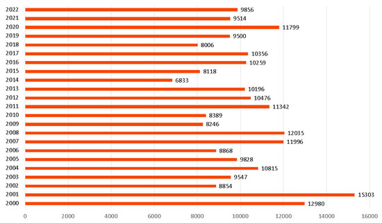 Annual number of forest fires in Greece, 2000–2022. Source: The Fire Service of Greece, https://www.fireservice.gr/el_GR/synola-dedomenon (accessed on 1 December 2023).