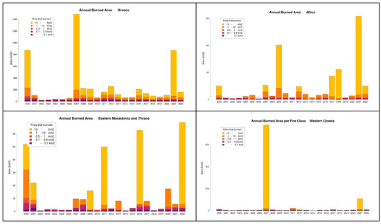 The total number of forest fires in Greece for the period 2000–2022 was 233,116 with the annual distribution shown in Figure 1. The fire events were grouped into five categories according to the size of the burned area: less than 10 hectares (ha); between 10 and 50 ha; between 50 and 100 ha; between 100 and 1000 ha; and more than 1000 ha. This structure provides a basis for examining vulnerability to different types of fires with respect to area burned and frequency of fires. The burned areas in Greece as a whole and in three selected regions are presented in Figure 2. The three regions were selected as examples of high vulnerability with respect to population density (Attika), high socioeconomic vulnerability (Eastern Macedonia and Thrace), and size of area burned by fires in a single year (Western Greece). (Graphs for the other ten regions of Greece are available from the authors upon request).