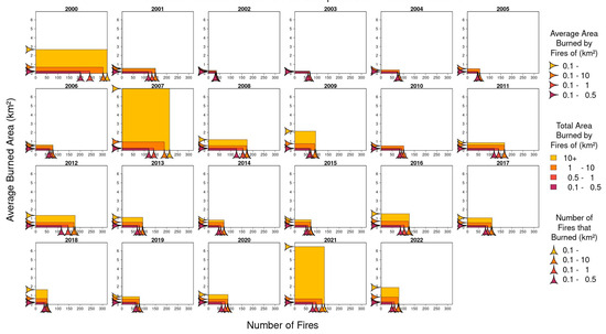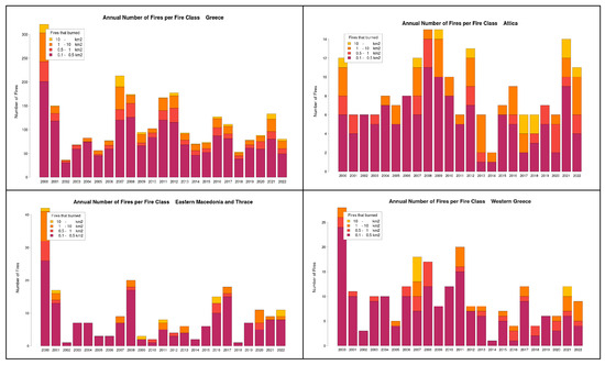 Area burned and number of fires for each category of fire in Greece, 2000–2022. Source: Data from The Fire Service of Greece and own calculations.