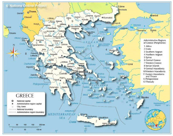 The regions of Greece. Source: Nations Online Project (https://www.nationsonline.org, accessed on 29 April 2024).