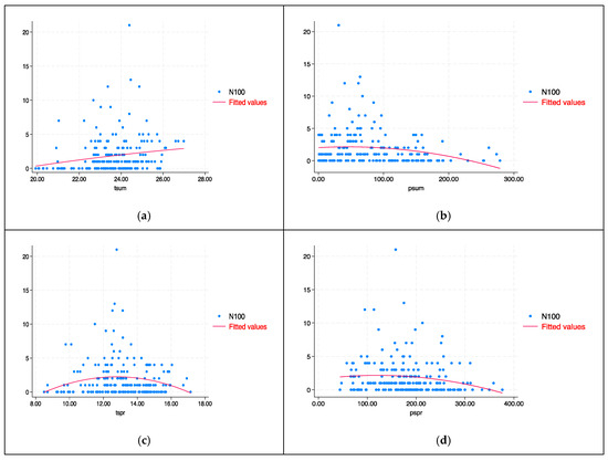 A description of the variables for the aggregate data for Greece is shown in Table 6. N100, N50, and N10 correspond to forest fires that burned more than 100, 50, and 10 ha per year respectively. The explanatory variables for summer and spring were denoted respectively as , for temperature in degrees Celsius, and for precipitation in mm.