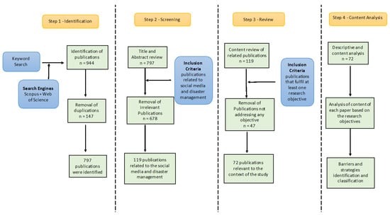 The selection process was limited to articles written in English and published online before the cut-off date of 22 November 2023. There were no constraints on the year of publication during the retrieval of publications. However, the authors acknowledge the limitations of the database selection and search strategy. This study employed only two prominent databases, namely Scopus and Web of Science. Furthermore, the selection process reflected on the used keywords only. The keywords for the current study were adopted by observing the keywords used in previous studies of a similar context. Most of the studies used only key terms (e.g., disaster, social media) for their keyword search [5,22,23]. Some of the studies used some synonyms and specific names of the key terms [4,24]. However, the usage of synonyms and specific names (e.g., Facebook, Instagram, flood, earthquakes) with the Boolean operator “OR” only expands the scope of search but does not restrict the papers being retrieved from the key terms used. Therefore, there is a very low chance of missing a significantly relevant paper due to the absence of some synonyms. Finally, to uphold the methodological rigour of this systematic review, non-academic and technical documents such as reports, discussions, websites, and similar materials were deliberately omitted, notwithstanding their widespread accessibility.