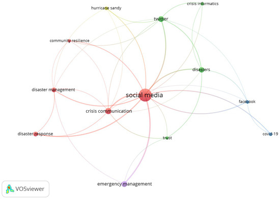 In VOS Viewer, the minimum number of occurrences of a keyword was set to 3, in order to generate the optimum legible network. Out of 208 keywords, 13 keywords met the threshold with five clusters, 35 links, and a total link strength of 51, as illustrated in Figure 2. Furthermore, the keywords which express the same meaning, such as disaster and disasters, crisis communication, communication, and disaster communication, were merged to appear as disasters and crisis communication, respectively. The size of each node indicates the number of occurrences of the keyword, while the link strength connecting two keywords shows the number of articles in which they appeared together [97]. The top keywords identified from the illustrated network are social media, crisis communication, emergency management, Twitter, and disasters. It was also identified that the ‘social media’ keyword is strongly linked (highly appeared) with the emergency management, crisis communication, disasters, and disaster management keywords, respectively.